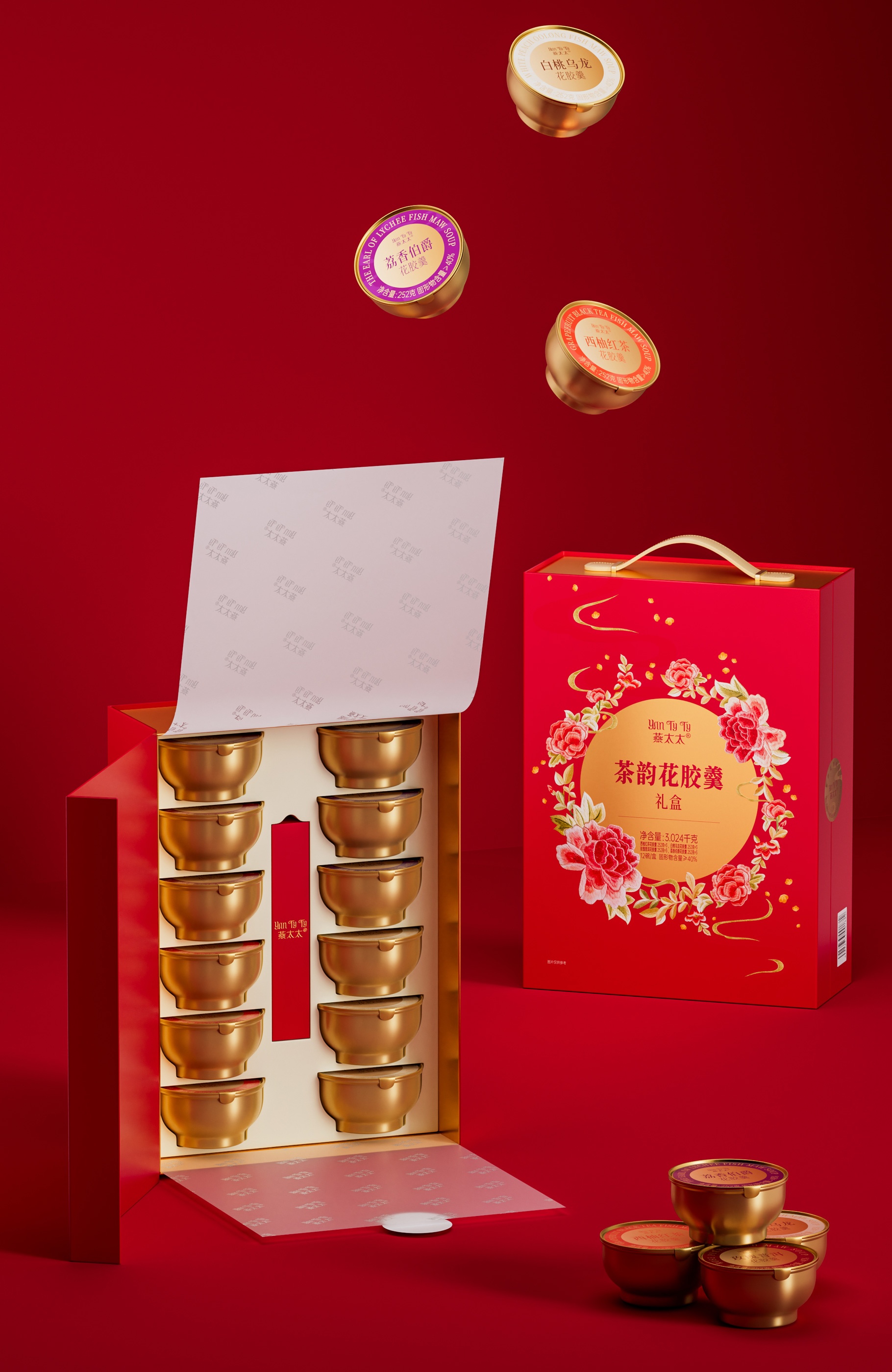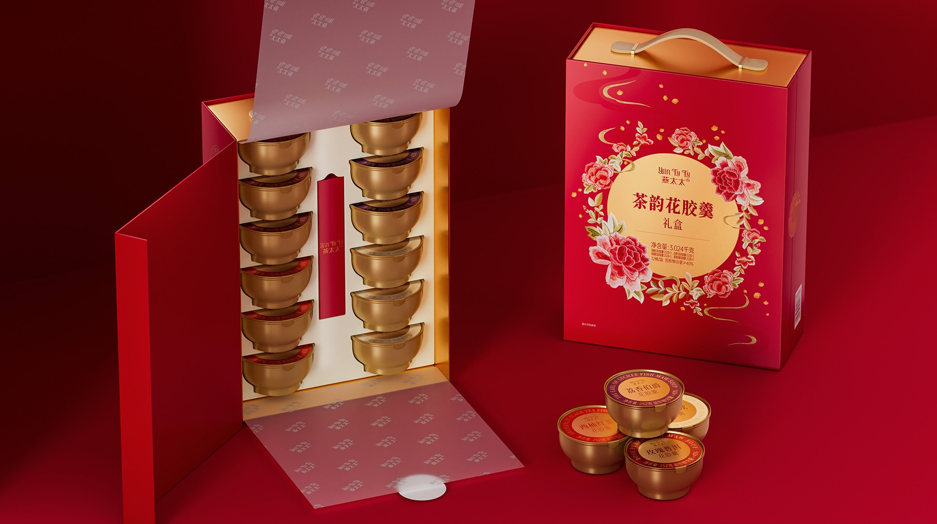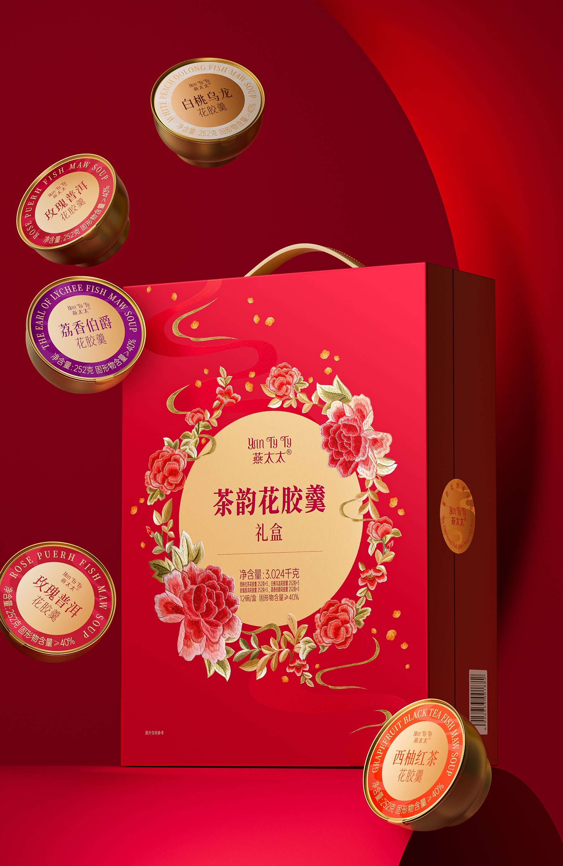 "燕太太"為山姆會員店專供的茶韻花膠羹禮盒:以刺繡工藝為核心,融合花與茶香圖騰元素的中秋花膠羹禮盒包裝。此設計旨在通過精細的刺繡技藝,展現自然之美、茶香之韻與中秋佳節的和諧氛圍,讓收禮者在享受美味的同時,也能感受到一份來自傳統文化的藝術享受與情感傳遞。